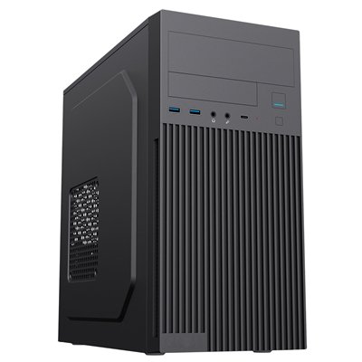 The CiT Mentor is a compact Micro-ATX business chassis designed for professional and office environments. Featuring a sleek black exterior and a distinctive ventilated front panel, the Mentor combines modern aesthetics with practical airflow for reliable system cooling.